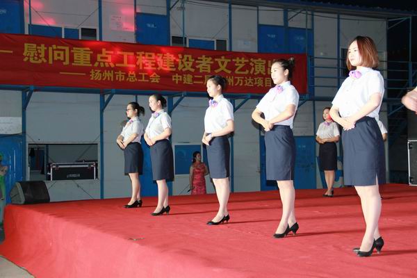5月3日晚,由揚州市總工會主辦、揚州市建設(shè)產(chǎn)業(yè)工會承辦的“建設(shè)者之歌”——慰問重點工程建設(shè)者文藝演出,在揚州萬達(dá)廣場項目部生活區(qū)隆重舉行。我公司參演的《七彩揚汽——員工行為規(guī)范操》得到了在場領(lǐng)導(dǎo)和工程建設(shè)者的一致好評。市總工會副主席洪慧娟,市建設(shè)產(chǎn)業(yè)工會主任田繼榮,市交通產(chǎn)業(yè)集團黨委副書記、紀(jì)委書記、工會主席王寧生等領(lǐng)導(dǎo)出席了晚會。