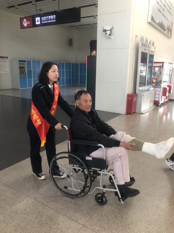 不一會(huì)兒,陪同的工友買好了當(dāng)天10:30分前往昆山的車票。高娟和另一位工作人員彭素青借來了輪椅,二人推著他來到了二樓發(fā)車檢票口,將他攙扶到座椅上坐好,并和發(fā)車班工作人員交接了尤師傅的情況,囑托他們多多照應(yīng),安排好一切后,高娟和彭素青才離開回到自己的工作崗位。尤師傅和工友都非常感謝揚(yáng)州站工作人員細(xì)心周到的服務(wù)。