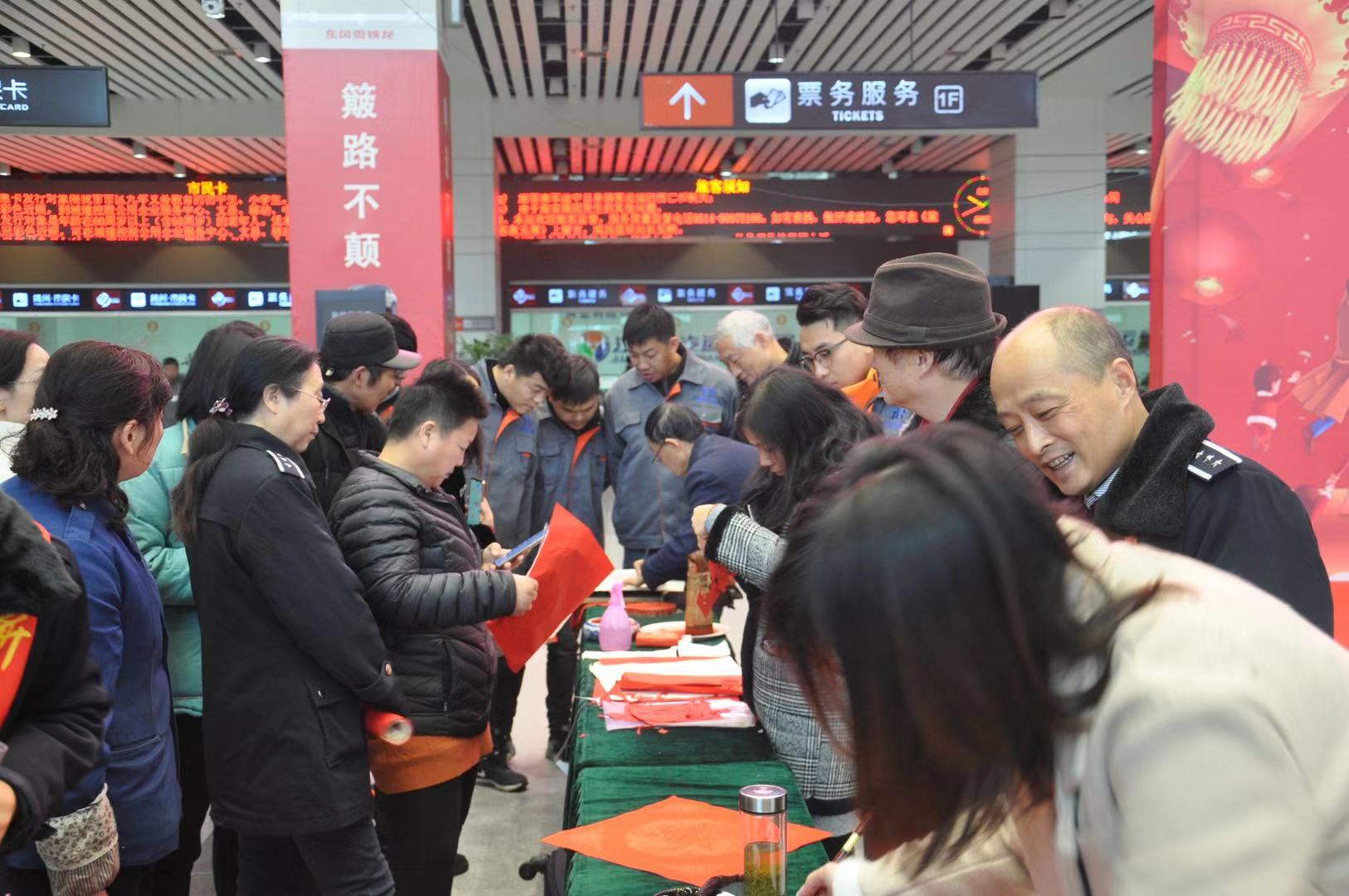 活動現(xiàn)場,揚州市書法協(xié)會、剪紙協(xié)會、揚州汽車站的志愿者和旅客們進行了書法、剪紙創(chuàng)作送祝福的互動,在這寒冷的冬季,為歸鄉(xiāng)的旅客送去溫馨的祝福,讓旅客“溫暖相伴·幸;丶”。