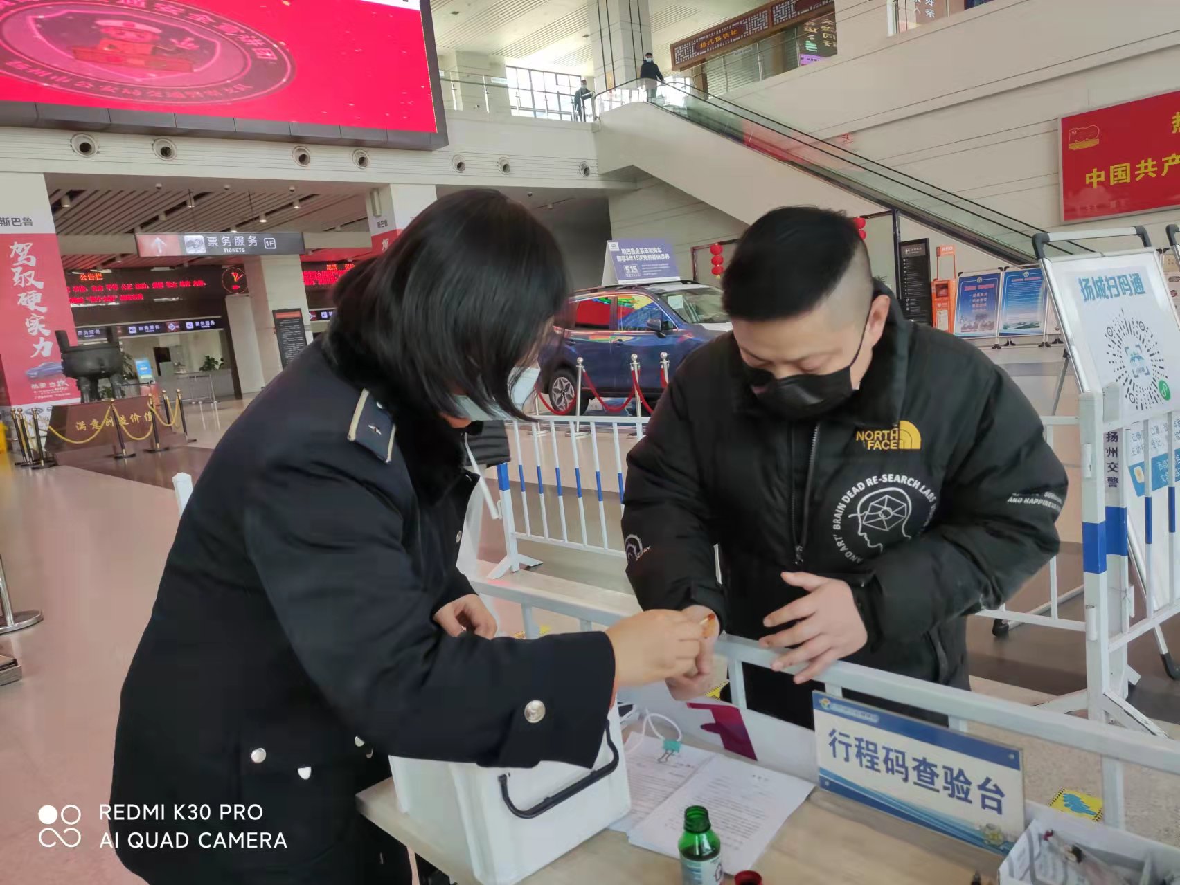 下午一點(diǎn)半,揚(yáng)州汽車(chē)站售票大廳門(mén)口,正在認(rèn)真查驗(yàn)行程碼的劉揚(yáng),看著對(duì)面遞身份證過(guò)來(lái)的一雙手,手上傷痕累累,手里握著一團(tuán)紙巾,紙巾上血跡斑斑,于是關(guān)切地詢問(wèn)起來(lái)。經(jīng)詢問(wèn)得知,原來(lái)旅客于先生是常州人,在揚(yáng)州出差三天了,估摸著今天的工作能夠忙完,想早點(diǎn)趕回常州,工作一結(jié)束,便從工作地點(diǎn)騎公共電動(dòng)車(chē)來(lái)?yè)P(yáng)州汽車(chē)站乘車(chē),誰(shuí)知一個(gè)不小心,摔了一跤,羽絨服破了,手機(jī)摔壞了,兩只手也蹭破了好幾處,血不停地淌。