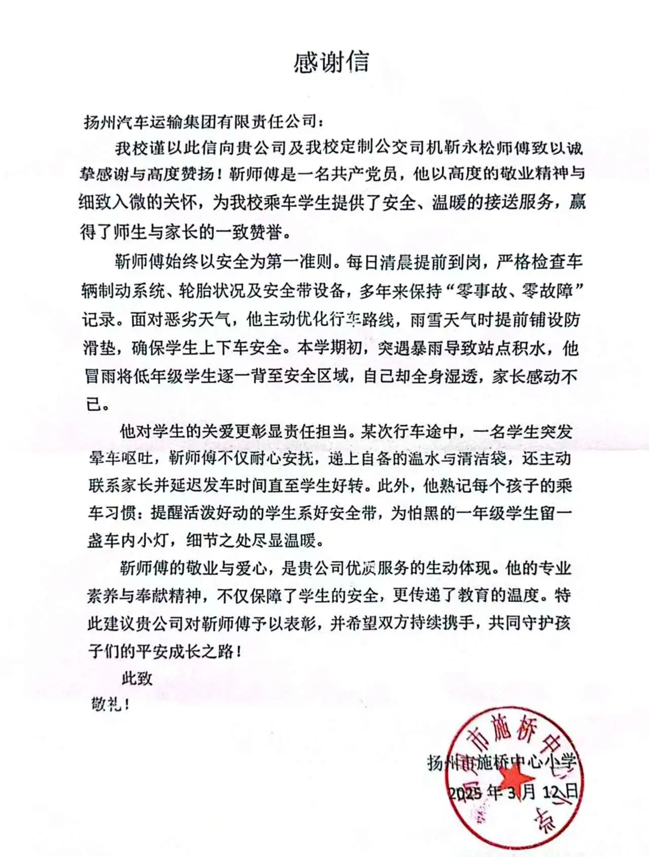 近日,揚(yáng)汽集團(tuán)營銷中心收到來自揚(yáng)州市施橋中心小學(xué)的感謝信,對(duì)校車司機(jī)靳永松師傅盡職盡責(zé)的安全護(hù)送服務(wù)以及對(duì)學(xué)生們的悉心照顧表示衷心的感謝。